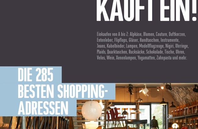 In ZÜRICH KAUFT EIN! 2015 finden Sie alles zum Thema Einkaufen. Von A bis Z: Alpkäse, Blumen, Couture, Duftkerzen, Entenleber, Flipflops, Gläser, Handtaschen, Instrumente, Jeans, Kabelbinder, Lampen, Modellflugzeuge, Nigiri, Ohrringe, Plaids, Quarktaschen, Rucksäcke, Schokolade, Tische, Uhren, Velos, Wein, Xenonlampen, Yogamatten, Zahnpasta und mehr.
