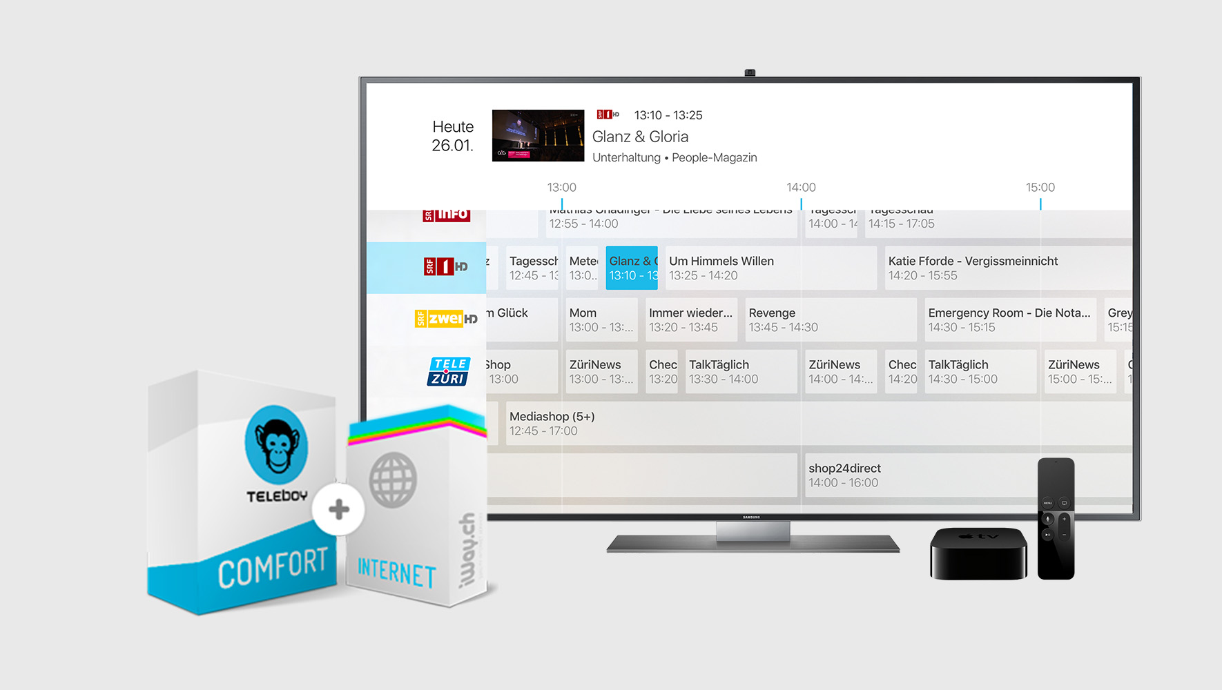 Im Unterschied zu den klassischen Angeboten kommen alle Angebote von Teleboy Home mit einem vollwertigen TV-Paket daher: 7-Tage-Replay, 1000h-Aufnahmespeicher, Timeshift bzw. Live-Pause und vieles mehr. Bei Swisscom & Co. sind diese Funktionen meist nur in den grössten Bundle-Angeboten enthalten.