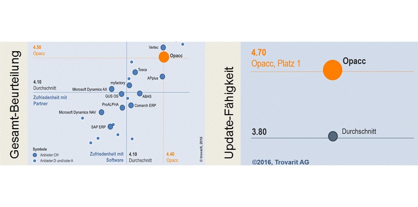 Opacc darf sich wiederum über ein hervorragendes Ergebnis freuen. Die Opacc Enterprise Software gehört klar zu den Gewinnern der neusten Trovarit-Studie.