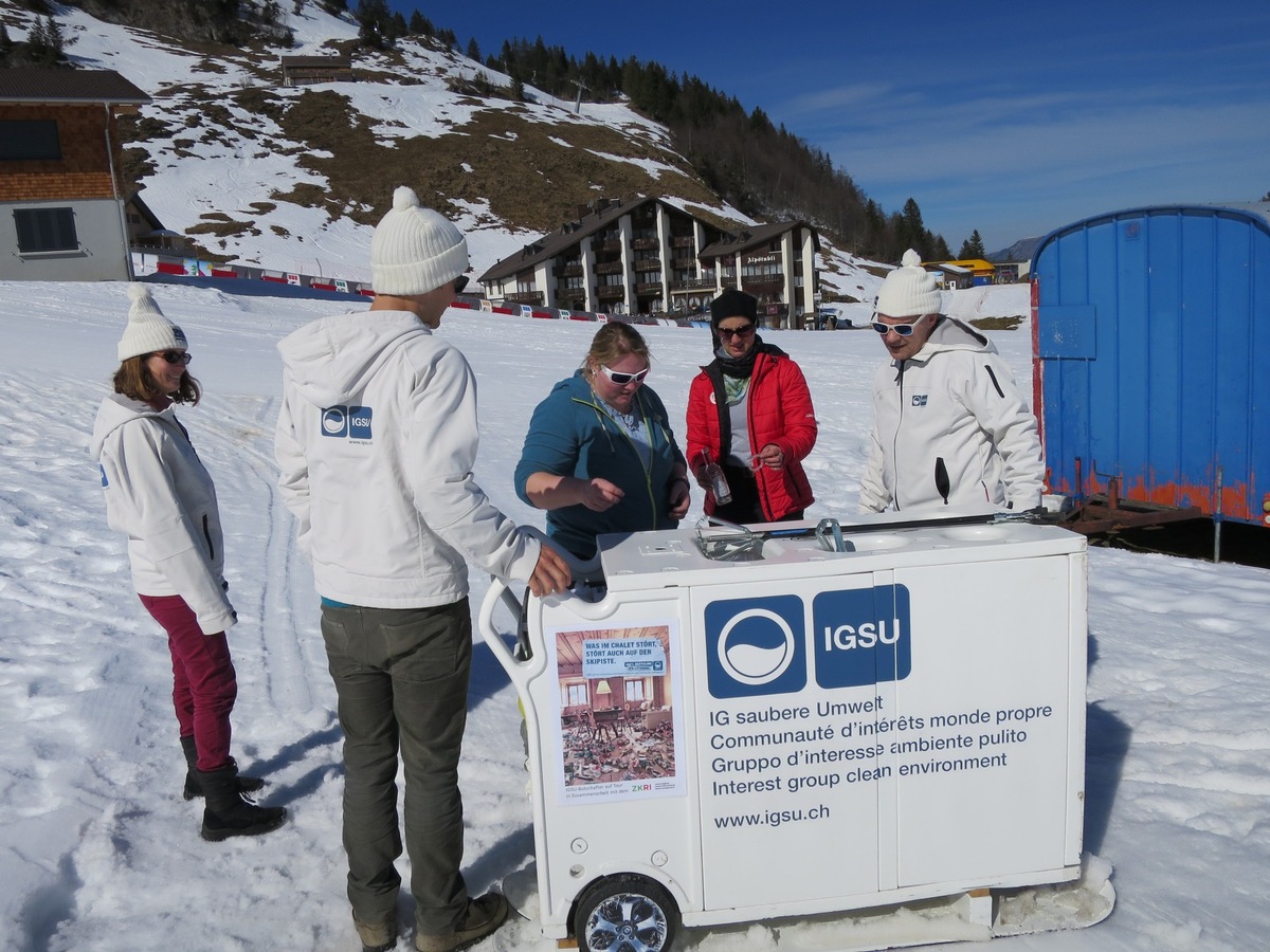 Am Grand Prix Migros und am Migros Ski Day vom vergangenen Wochenende wurde das autofreie Bergdorf Stoos zum Treffpunkt von jungen Skifahrerinnen und -fahrern, Skifans und Familien. Damit Pisten, Wanderwege und Dorf auch bei diesem grossen Besucheraufkommen sauber blieb, sensibilisierten die Botschafter-Teams des Schweizer Kompetenzzentrums gegen Littering IGSU vor Ort für die Littering-Problematik.