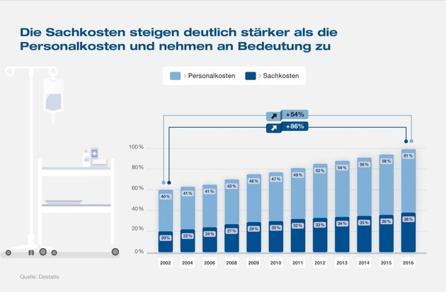Seit 2002 stiegen die Sachkosten insgesamt um 86 Prozent. Die Personalkosten erhöhten sich im gleichen Zeitraum um 54 Prozent, wuchsen also deutlich schwächer. Dennoch sind die Gehälter der Mitarbeiter der weitaus größte Posten in den Büchern der Krankenhäuser. Hier setzt das Krankenhausstrukturgesetz an: Es bewertet für die Fallpauschalen die Sachkosten geringer und setzt die Pflegekosten höher an. Zugleich werden erstmals private Krankenhäuser in die Bemessungsgrundlage für die Vergütung der Standardfälle einbezogen. Beide Vorgaben gemeinsam bewirken, dass Krankenhäuser ihre Ausgaben für Sachmittel auf den Prüfstand stellen und Einsparpotenziale finden müssen, um künftig kostendeckend arbeiten zu können.