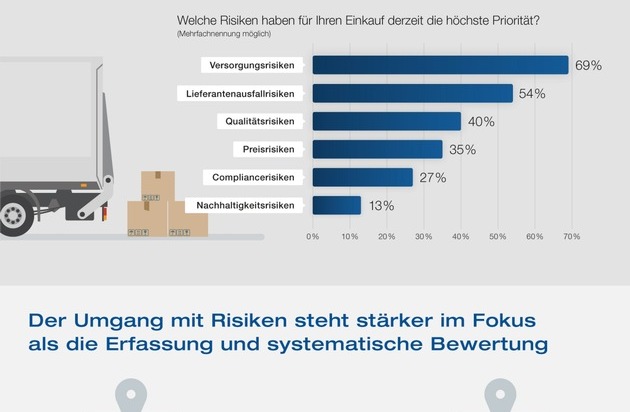 Veraltete digitale Technologien und die Furcht, Opfer von IT-Kriminalität zu werden, führen in der Umfrage die Liste der allgemeinen Risiken für Unternehmen an. Über 50 Prozent der Befragten machen sich Sorgen um diese Themen. Konkret auf den Einkauf bezogen, nennen die Teilnehmer Versorgungsrisiken (69 Prozent), die Abhängigkeit von Lieferanten (56 Prozent) sowie Risiken bei Qualität (40 Prozent) und Preis (35 Prozent) am häufigsten.