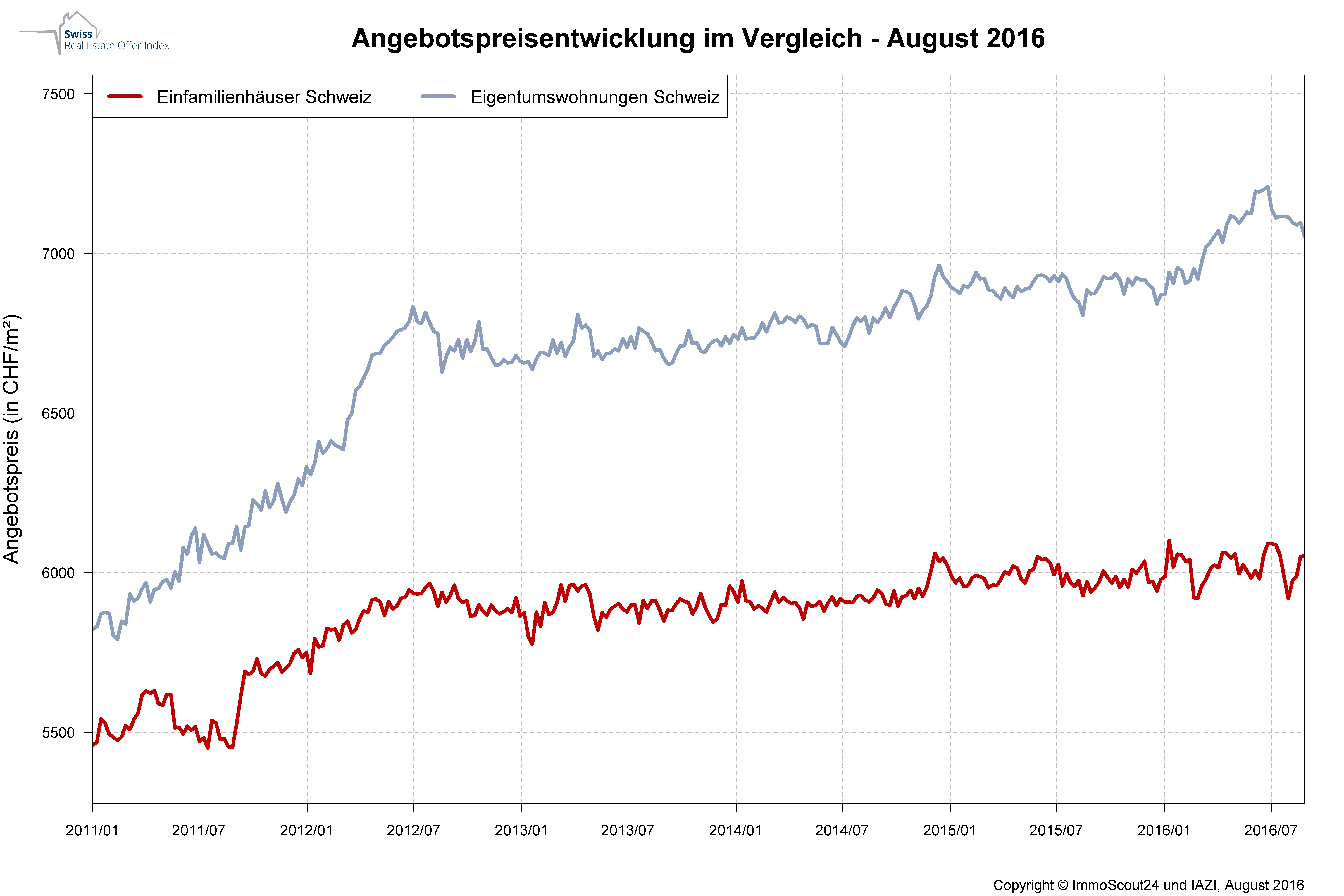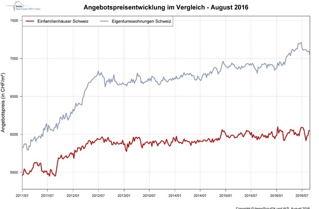 Nachdem die Angebotspreise für Eigentumswohnungen im ersten Halbjahr 2016 kontinuierlich gestiegen sind, weist der von ImmoScout24 in Zusammenarbeit mit dem Immobilien-Beratungsunternehmen IAZI AG erhobene Swiss Real Estate Offer Index seit Juli eine rückläufige Tendenz bei den Preisen für Stockwerkeigentum aus. Nach einem moderaten Rückgang von 0,4 Prozent im Juli lässt sich im August ein Abschlag von 1,5 Prozent beobachten. Im landesweiten Mittel wird der Quadratmeter Nettowohnfläche für Eigentumswohnungen nunmehr für 7'021 Franken angeboten.