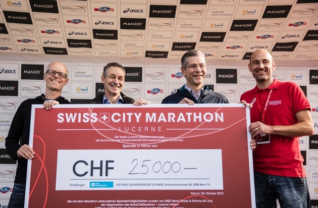 Pour la deuxième fois, lors du marathon de ce jour, l'entreprise de santé MSD et le SwissCityMarathon Lucerne ont mis à disposition des places de départ pour une bonne cause. Les coureuses et les coureurs ont ainsi pu s'assurer de l'une des 100 places convoitées. La recette de 25'000 francs issue de la contribution des participantes et des participants et des dons supplémentaires vont à la fondation SOS Villages d'Enfants Suisse.