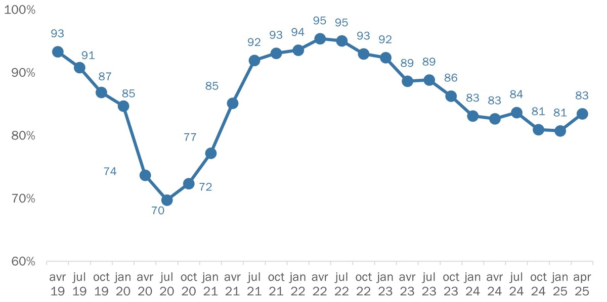 Les perspectives pour le deuxième trimestre restent prudentes: environ la moitié des entreprises ne s’attendent à aucun changement par rapport à l’année dernière en termes de chiffre d’affaires, de commandes et de marges. En ce qui concerne le personnel, ce sont même les deux tiers. Le bilan des évaluations reste négatif pour tous les indicateurs. 17 pour cent des entreprises sont actuellement touchées par le chômage partiel – dans un tiers de ces entreprises, cela concerne plus de 40 pour cent du personnel.