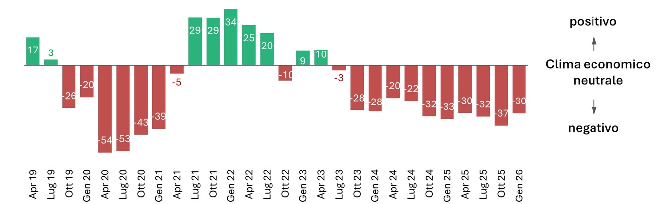 L’indice del clima economico di Swissmechanic per le PMI dell’industria MEM mostra anche a inizio del 2026 il perdurare di una situazione precaria nell’industria metalmeccanica ed elettrica. Con circa –30 punti, l’indice rimane chiaramente in territorio negativo. Tre quarti delle aziende giudicano sfavorevole la loro attuale situazione economica. Non si intravede ancora una ripresa consistente.