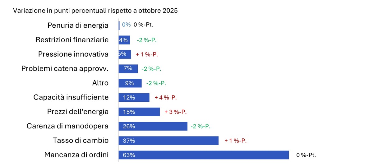 Le restrizioni finanziarie impediscono al 26% delle aziende di investire; un leggero aumento rispetto all’autunno 2025. Il motivo principale risiede nella mancanza di fondi propri. Allo stesso tempo, due terzi delle aziende prevedono di mantenere costanti le loro capacità produttive. Tuttavia, non si può parlare di una forte espansione.