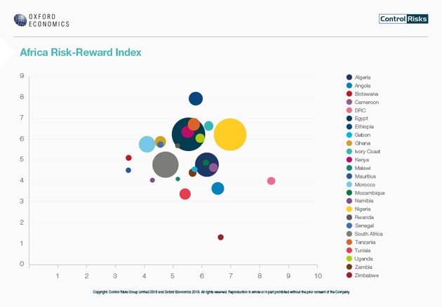 Simbabwe, Ägypten und Ghana liegen vorn im Vergleich der Auswertung ihres Chancen-Risiko-Verhältnisses von September 2017 mit den Zahlen von Juni 2018, laut Africa Risk-Reward Index von Control Risks und Oxford Economics. Dicht dahinter liegen Nigeria und Mosambik, die ihre Zahlen im Bereich der Chancen am meisten verbessern und gleichzeitig ihre Risikobewertung für Investitionen am weitesten senken konnten.