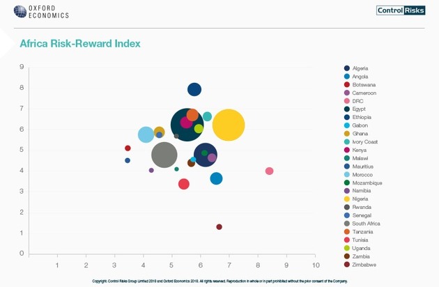 Jean Devlin, Partner und Head of African Analysis bei Control Risks, meint hierzu: "2017 war ein schwieriges Jahr für viele afrikanische Volkswirtschaften. Aber tiefgreifende politische Veränderungen, insbesondere im Süden Afrikas, und gestiegene Rohstoffpreise haben eine Wende für viele Märkte eingeläutet. Afrikas größte Märkte - Nigeria, Südafrika und Ägypten - konnten alle ihr Chancen-Risiko-Verhältnis verbessern, doch finden sich auch kleinere Länder unter den Gewinnern. Simbabwe, Mosambik, Sambia und Senegal sind unter den Top 10 derjenigen Länder, die ihre Chancenbewertung verbessern und ihre Risikozahlen senken konnten. Diese Entwicklung wird sicher Investoren anlocken, die ihre Präsenz auf dem Kontinent ausbauen wollen."