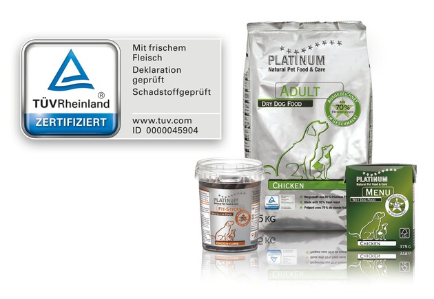 Das Siegel "TÜV Rheinland zertifiziert", das vor Kurzem an die PLATINUM GmbH & Co. KG aus Bingen am Rhein vergeben worden ist, gilt fortan für die komplette gleichnamige Hundenahrungs-Produktfamilie - bestehend aus der Trockennahrung "PLATINUM Adult" und "PLATINUM Puppy", der Nassnahrung "PLATINUM MENU" sowie aus unterschiedlichen Belohnungs-Snacks.
