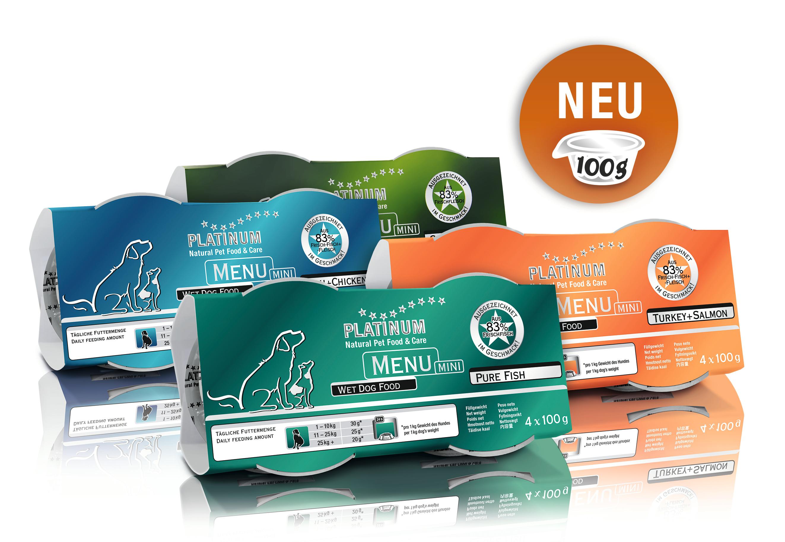"PLATINUM MENU", die vollwertige natürliche Hunde-Nassnahrung aus dem Hause PLATINUM, gibt es jetzt nicht nur in den vier bekannten und beliebten Geschmacksvarianten, sondern auch in unterschiedlichen Verpackungsgrößen: Ab sofort ist die hochwertige Nahrung für erwachsene Hunde, die weder Geschmacksverstärker noch Lockstoffe enthält, auch als "PLATINUM MENU Mini" in einer praktischen 100-Gramm-Schale erhältlich. Das neue Angebot ergänzt die bisherige Packungsgröße von "PLATINUM MENU", deren Inhalt 375 Gramm beträgt.