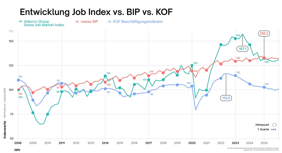 Medienkontakt Medienstelle der Adecco Group Switzerland Tel. +41 79 560 48 32, press.office@adeccogroup.ch Stellenmarkt-Monitor Schweiz, Universität Zürich Johanna Bolli-Kemper, Tel. +41 44 635 23 02, bolli-kemper@soziologie.uzh.ch Über den Adecco Group Swiss Job Market Index (Job Index) In Zusammenarbeit mit dem Stellenmarkt-Monitor Schweiz (SMM) am Soziologischen Institut der Universität Zürich veröffentlicht die Adecco Group Switzerland jeweils im Januar, April, Juli und Oktober den Adecco Group Swiss Job Market Index (Job Index). Mit dem Job Index steht für die Schweiz eine wissenschaftlich fundierte und umfassende Messgrösse für die Entwicklung des Stellenangebots in Online-Stellenportalen und Websites von Unternehmen zur Verfügung. Er beruht auf repräsentativen Quartalserhebungen der Stellenangebote in der Presse, auf Online- Stellenportalen sowie auf Websites von Unternehmen. Über die Adecco Group Switzerland Die Adecco Group Switzerland ist der Schweizer Marktführer im Bereich Human Resources. Mit mehr als 700 Mitarbeitenden an über 50 Standorten in allen Sprachregionen unterstützen wir jedes Jahr etwa 26’000 qualifizierte Arbeitskräfte dabei, sich neuen beruflichen Herausforderungen zu stellen. Unsere Marken sind alle auf ihren jeweiligen Bereich spezialisiert. Wir bieten massgeschneiderte Lösungen für Arbeitssuchende bei kleinen, mittleren und grossen Unternehmen in folgenden Bereichen des Personalwesens: Personal- und Temporärvermittlung, Payrolling, Ausgliederung und Auslagerung von ganzen HR-Prozessen, Karriereplanung, Talentförderung und -mobilität. In der Schweiz werden wir von folgenden Marken vertreten: Adecco, Adia, Akkodis, Pontoon Solutions, Lee Hecht Harrison und General Assembly. Die Adecco Group Switzerland ist ein Mitglied der Adecco Group, dem weltweit führenden Unternehmen für Talentberatung und -lösungen. Wir glauben daran, jeden Menschen auf die Zukunft vorbereiten zu können, und finden jeden Tag Arbeit für über 3,5 Millionen Stellensuchende. Wir rekrutieren, entwickeln und schulen Talente in 60 Ländern und ermöglichen es Unternehmen, die Zukunft der Arbeit zu gestalten. Die Adecco Group hat ihren Hauptsitz in Zürich, Schweiz (ISIN: CH0012138605), und ist an der SIX Swiss Exchange (ADEN) kotiert.