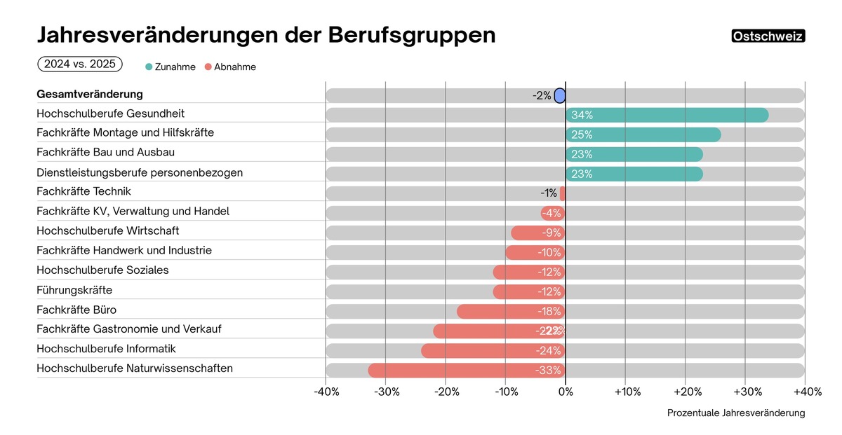 - Ostschweiz (-2%): Vor allem die Hochschulberufe Gesundheit (+34%) sowie Montage- und Hilfskräfte (+25%) und Bau und Ausbau (+23%) legen deutlich zu. Gleichzeitig verzeichnen die Hochschulberufe Naturwissenschaften (-33%), Informatik (-24%) sowie Gastronomie und Verkauf (-22%) starke Rückgänge.