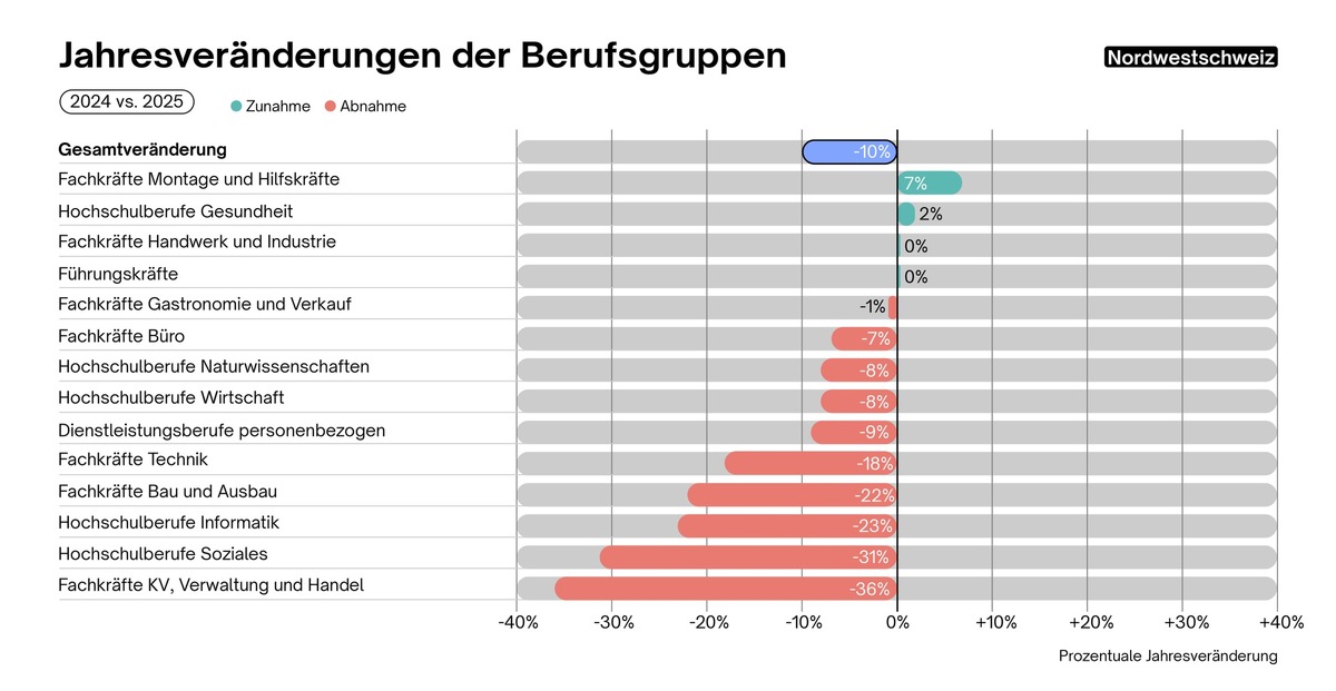 - Nordwestschweiz (-10%): Zunahmen beschränken sich auf Fachkräfte Montage- und Hilfskräfte (+7%) sowie die Hochschulberufe Gesundheit (+2%). Demgegenüber fallen die Rückgänge bei Fachkräften KV, Verwaltung und Handel (-36%), den Hochschulberufen Soziales (-31%) und Informatik (-23%) besonders deutlich aus.