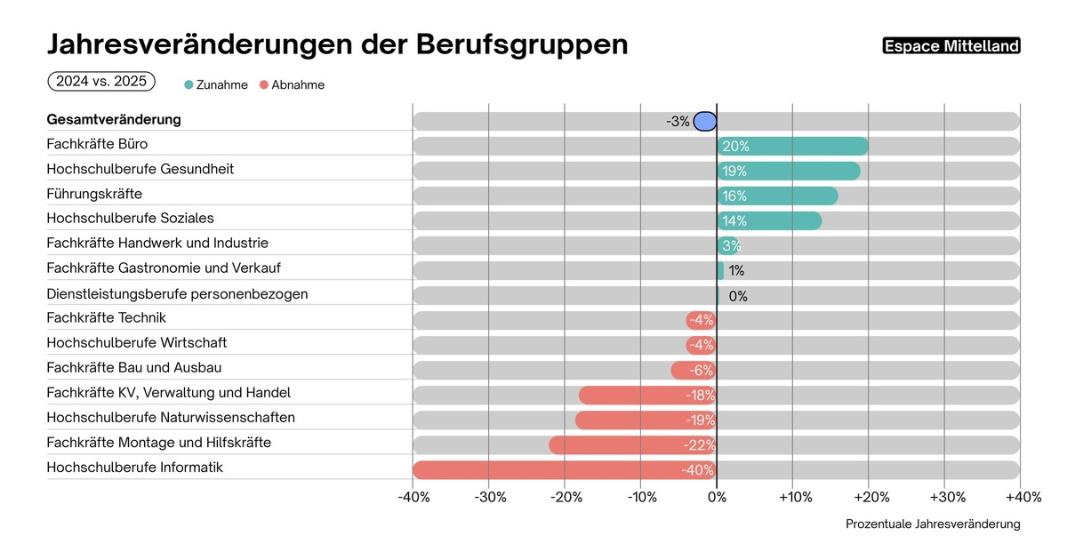 - Espace Mittelland (-3%): Es zeigt sich ein deutlicher Anstieg bei den Fachkräften Büro (+20 %), den Hochschulberufen Gesundheit (+19%) und bei den Führungskräften (+16%). Gleichzeitig verzeichnen die Hochschulberufe Informatik (-40%), die Fachkräfte KV, Verwaltung und Handel (-29%) sowie Montage- und Hilfskräfte (-22%) starke Rückgänge.