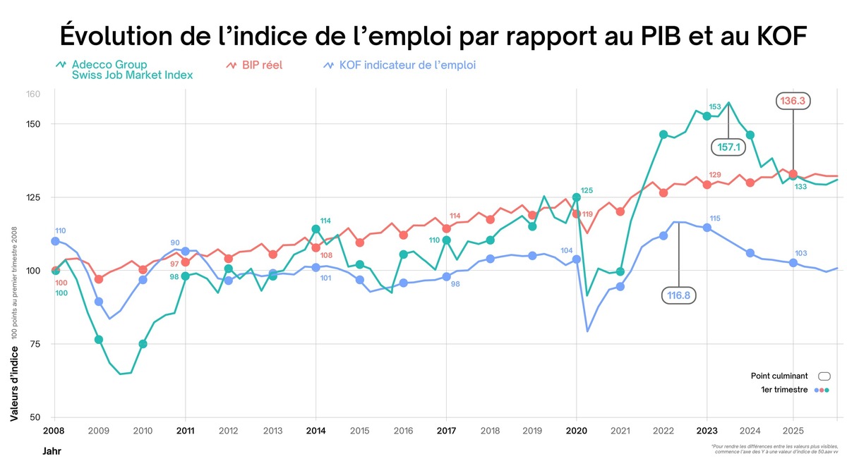 Contact médias Service presse du Groupe Adecco Suisse Tél. +41 79 560 48 32, press.office@adeccogroup.ch Stellenmarkt-Monitor Schweiz, Université de Zurich Johanna Bolli-Kemper, tél. +41 44 635 23 02, bolli-kemper@soziologie.uzh.ch À propos de l’Adecco Group Swiss Job Market Index (Job Index) En collaboration avec le Stellenmarkt-Monitor Schweiz, le moniteur du marché de l’emploi suisse de l’Université de Zurich, le Groupe Adecco Suisse publie sur une base trimestrielle l’Adecco Group Swiss Job Market Index (indice de l’emploi). L’indice de l’emploi constitue pour la Suisse une vaste unité de mesure scientifique sur le développement de l’offre d’emploi dans les portails d’emplois en ligne et les sites Web des entreprises. Il repose sur des enquêtes trimestrielles représentatives portant sur les offres d’emploi publiées dans la presse, sur les portails d’emplois en ligne ainsi que sur les sites Web d’entreprises. À propos du Groupe Adecco Suisse Le Groupe Adecco Suisse est le n° 1 suisse du domaine des ressources humaines. Comptant plus de 700 collaborateurs sur plus de 50 sites dans toutes les régions linguistiques, nous aidons chaque année près de 26 000 spécialistes à trouver un nouveau défi professionnel. Nos marques spécialisées sont expertes dans leur domaine. Le Groupe Adecco Suisse propose des solutions sur mesure non seulement aux demandeurs d’emploi mais encore aux petites, moyennes et grandes entreprises dans le domaine des ressources humaines: recrutement pour des emplois fixes ou temporaires, payroll services, dissociation et externalisation de processus RH complets, planification professionnelle, promotion et mobilité des talents. En Suisse, nous sommes représentés par les marques suivantes: Adecco, Adia, Akkodis, Pontoon Solutions, Lee Hecht Harrison et General Assembly. Le Groupe Adecco Suisse est une société du Groupe Adecco, le leader mondial du conseil et des solutions en matière de talents. Nous sommes convaincus que chacun doit être prêt pour l’avenir, c’est pourquoi nous trouvons du travail à plus de 3,5 millions de personnes chaque jour. Nous formons, développons et recrutons des talents dans 60 pays, permettant aux organisations de contribuer au développement de l’avenir du travail. Le Groupe Adecco a son siège à Zurich, en Suisse (ISIN: CH0012138605) et est coté à la SIX Swiss Exchange (ADEN).