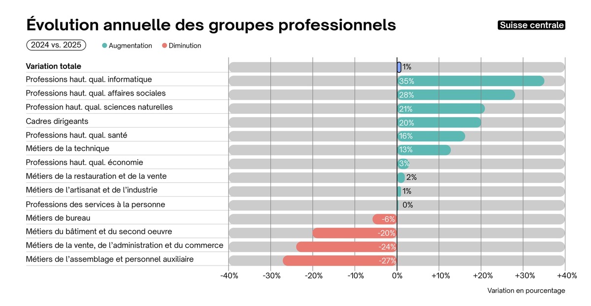 - Suisse centrale (+1%) : Les professions hautement qualifiées dans le domaine de l’informatique enregistrent une croissance particulièrement marquée (+35 %), de même que celles des affaires sociales (+28% ; p. ex. enseignant·e·s, juristes) et des sciences naturelles (+21% ; p. ex. chimistes, spécialistes des sciences de la vie, ingénieur·e·s en génie mécanique et en génie civil). En revanche, les métiers de l'assemblage et personnel auxiliaire (-27% ; p. ex. opérateur·rice·s d’installations et de machines, conducteur·rice·s de bus et de tramway) affichent le recul le plus important des postes vacants, suivis des métiers de la vente, de l’administration et du commerce (-24%) ainsi que des métiers du bâtiment et du second œuvre (-20% ; charpentier·ère·s, couvreur·euse·s ou électricien·ne·s et électronicien·ne·s).