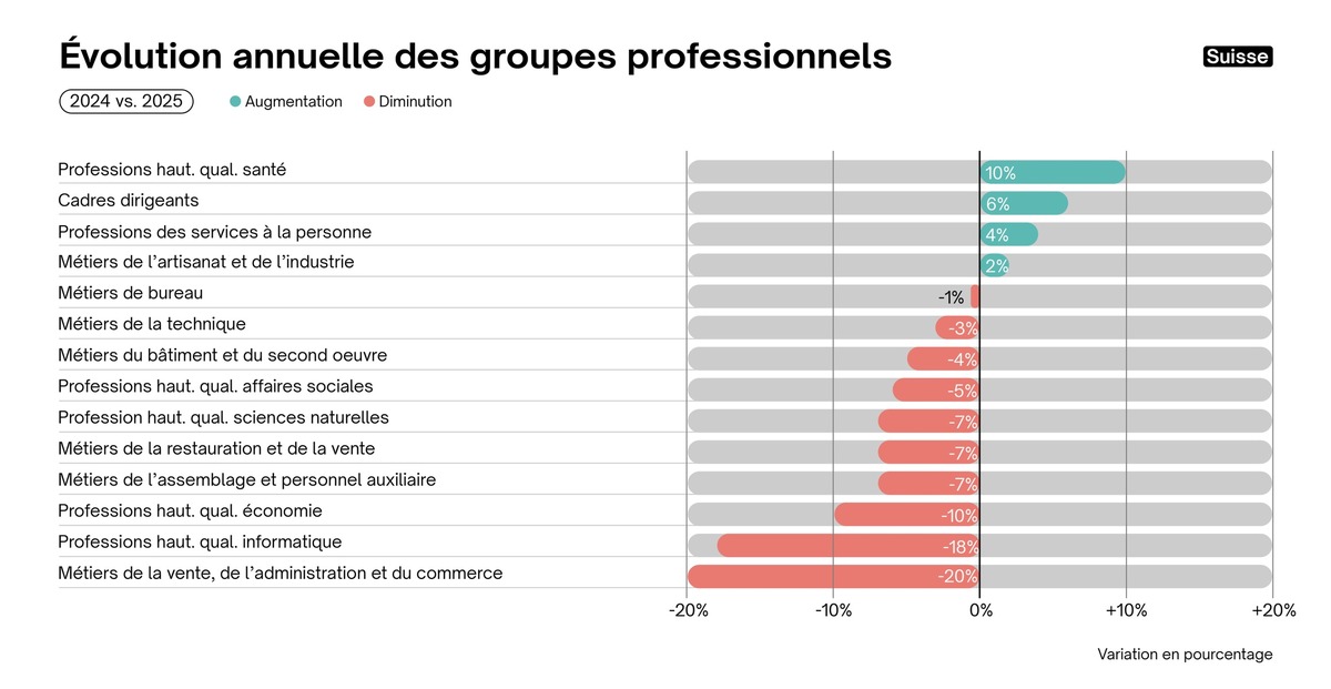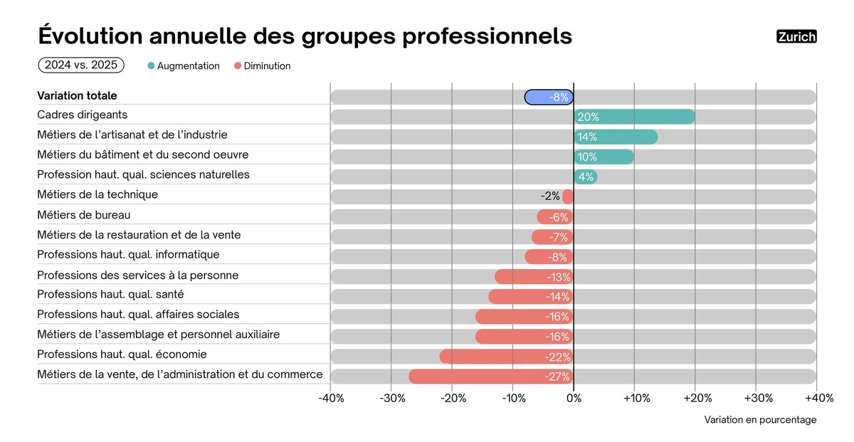 - Zurich (-8%) : les hausses concernent avant tout les cadres dirigeants (+20%), ainsi que les métiers de l’artisanat et de l’industrie (+14% ; p. ex. polymécanicien·ne·s, horloger·ère·s, artificier·ère·s et responsables de tirs de mines) et le bâtiment et le second œuvre (+10 %). À l’inverse, les métiers de la vente, de l’administration et du commerce (-27%), les professions hautement qualifiées dans le domaine de l’économie (-22%) ainsi que les professions hautement qualifiées dans le domaine des affaires sociales et les métiers de l'assemblage et personnel auxiliaire (-16% chacun) enregistrent des reculs marqués.
