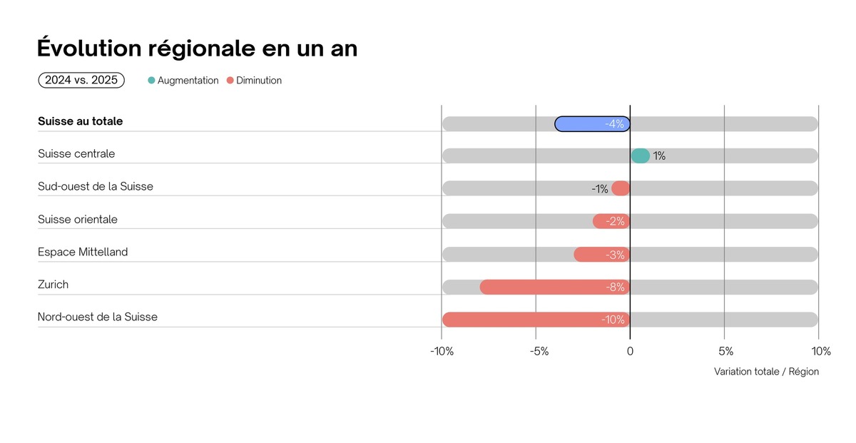 En comparaison annuelle, presque toutes les grandes régions affichent un recul du nombre d'emplois. Seule la Suisse centrale enregistre une légère augmentation de +1%. Des baisses modérées s'observent en Sud-Ouest de la Suisse (-1%), en Suisse orientale (-2%) et dans l'Espace Mittelland (-3%). Les reculs sont nettement plus marqués dans les centres économiques importants que sont Zurich (-8%) et la Suisse du Nord-Ouest (-10 %).
