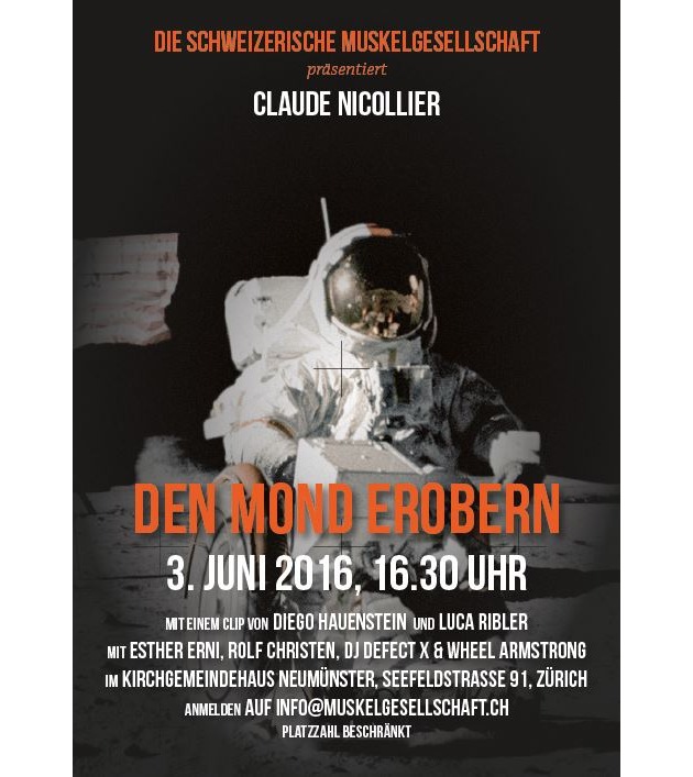 16.30 Uhr Einlass und Apéro 17.00 Uhr Begrüssung durch die Muskelgesellschaft 17.15 Uhr Launch neue Website und Premiere Videoclip «Den Mond erobern» Persönliche Erfahrungen von und mit: Esther Erni, Rolf Christen - Betroffene Wheel Armstrong Diego Hauenstein, Luca Ribler - Regisseure 18.00 Uhr Claude Nicollier - Schritte im Weltraum Erster und einziger Schweizer im Weltraum 18.50 Uhr Fragen 19.30 Uhr Ende offizieller Teil