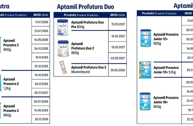 En concertation avec les autorités suisses, Danone rappelle en Suisse certains lots de production d’Aptamil – dans le contexte de la mise à jour des recommandations concernant le seuil de céréulide. Le rappel concerne les produits mentionnés en annexe, avec les dates de durabilité minimale (DDM) indiquées.
