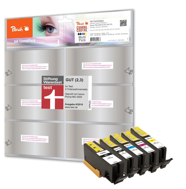 Von der Stiftung Warentest mit dem Qualitätsurteil 'Gut' ausgezeichnet, gibt es die Peach Tintenpatronen mit Chip für die Canon PGI-550 XL und CLI-551 ab sofort im preisgünstigen Combi Pack für 23,60 Euro - http:///www.3ppp3.de