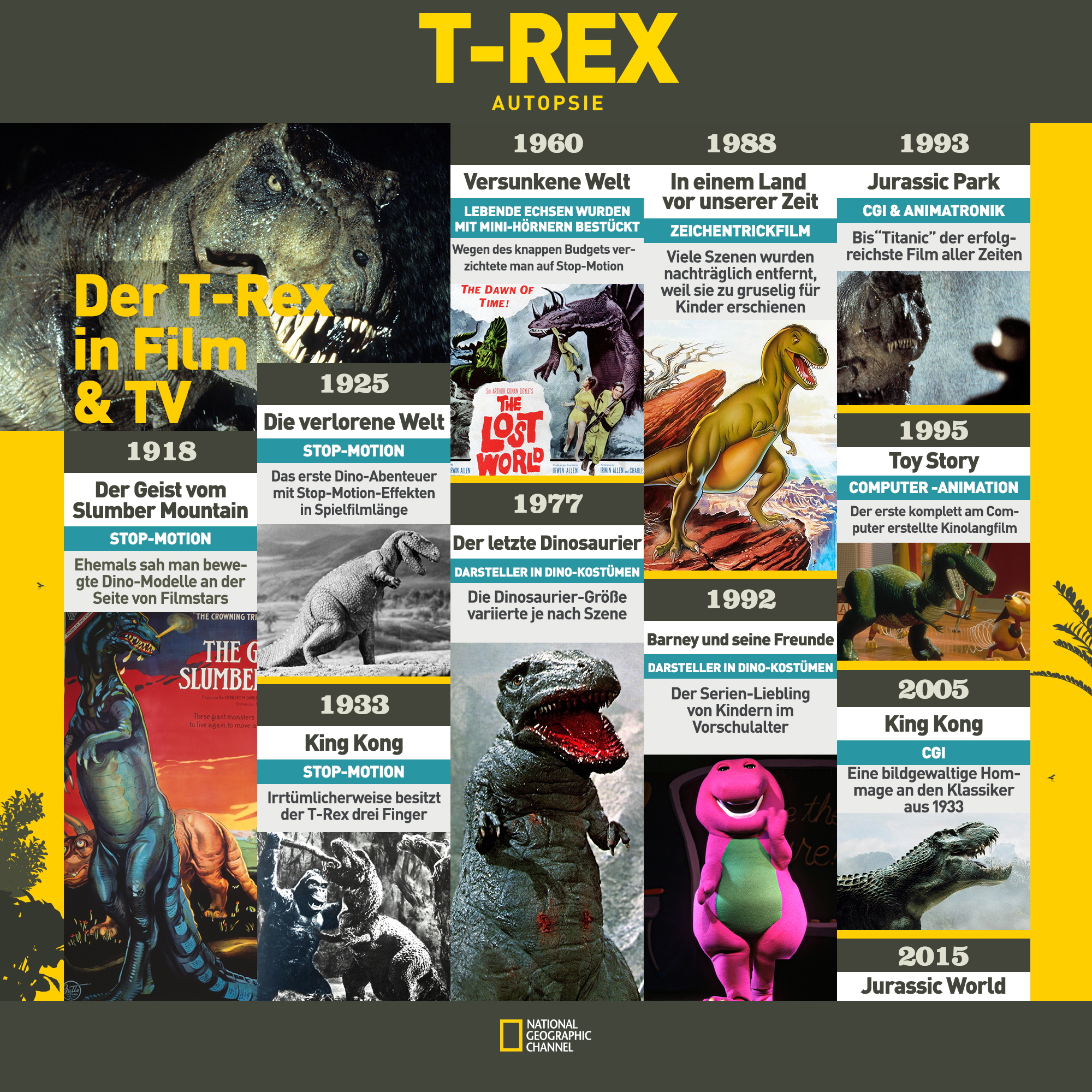Gleich zu Beginn der Sonderprogrammierung erlebt der Zuschauer, worauf die Menschheit seit gefühlten 65 Millionen Jahren gewartet hat: die weltweit erste Dinosaurier-Autopsie. Was bisher als unvorstellbar galt, lassen Paläontologen und Special-Effects-Experten aus Hollywood Realität werden. Die Spezialisten fertigten zunächst eine anatomisch korrekte Kopie des berühmtesten fleischfressenden Sauriers Tyrannosaurus Rex an. Im Gegensatz zu üblichen Modellen beschränkten sich die Forscher dieses Mal jedoch nicht auf das Skelett. Ihr Ziel: Der erste lebensechte Nachbau eines T-Rex. In Zusammenarbeit mit renommierten Tierchirurgen konstruierten sie realitätsgetreue Organe. Mit Hilfe Unmengen Liter Kunstblut hauchten sie dem fleischfressenden Riesen schließlich neues Leben ein. Den Wissenschaftlern war es somit möglich, den beängstigenden Giganten von Kopf bis Fuß zu untersuchen. Die Dokumentation dieses bahnbrechenden Projekts geht buchstäblich unter die Haut und lässt die Zuschauer einem Dinosaurier aus wissenschaftlicher Sicht so nahe kommen, wie nie zuvor.