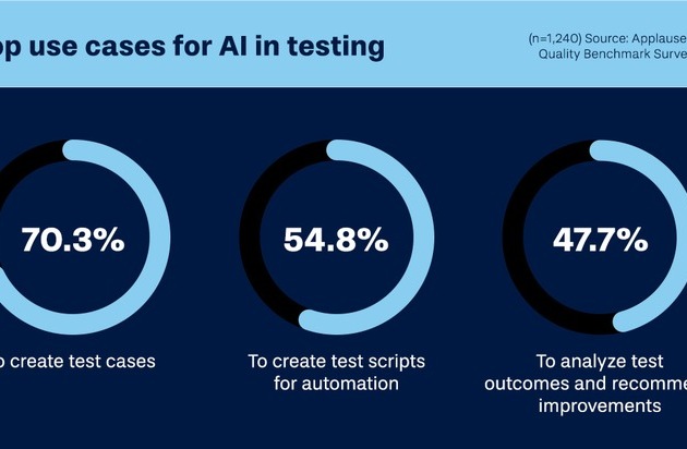 - Unternehmen nutzen KI zur Entwicklung von Testfällen (70 Prozent), zur Automatisierung von Testskripten (55 Prozent) sowie zur Analyse von Testergebnissen und zur Empfehlung von Verbesserungen (48 Prozent). Weitere Anwendungsfälle sind die Priorisierung von Testfällen, die autonome Testausführung und -anpassung, die Identifizierung von Lücken in der Testabdeckung und die "Self-Healing"-Testautomatisierung.
