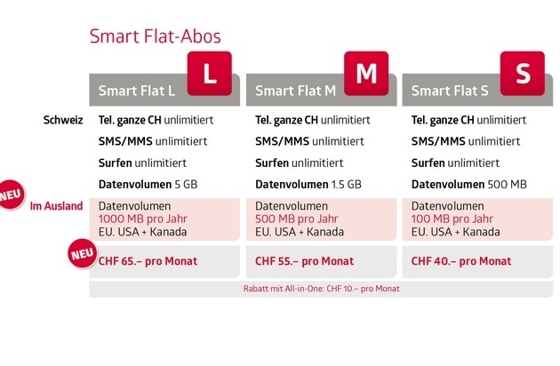 - Das grösste Mobile Abo, Smart Flat L wird 10 Franken günstiger und kostet jetzt 65 Franken pro Monat.