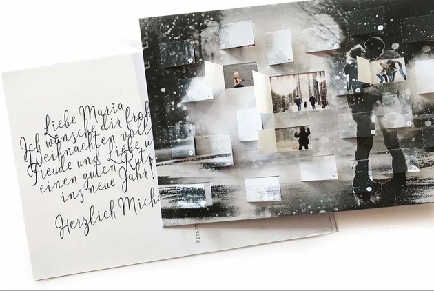 Der erste Dezember steht vor der Tür. Höchste Zeit, um Freunde und Familie mit einem persönlichen Adventsgeschenk zu überraschen. Der Adventskalender To Go ist mit wenigen Klicks erstellt und wird direkt an die Liebsten verschickt. Die Beschenkten dürfen sich auf 25 Fotos und eine Grussbotschaft in schöner Handschrift freuen. Der Postkarten-Kalender hat ein Format von 17 x 23 cm.