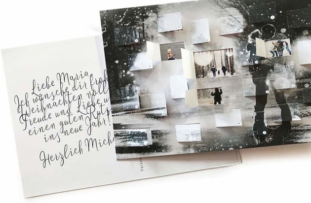 Der erste Dezember steht vor der Tür. Höchste Zeit, um Freunde und Familie mit einem persönlichen Adventsgeschenk zu überraschen. Der Adventskalender To Go ist mit wenigen Klicks erstellt und wird direkt an die Liebsten verschickt. Die Beschenkten dürfen sich auf 25 Fotos und eine Grussbotschaft in schöner Handschrift freuen. Der Postkarten-Kalender hat ein Format von 17 x 23 cm.
