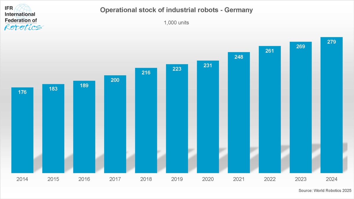 Die deutsche Industrie ist europäischer Spitzenreiter bei der Roboter-Automation: Der operative Bestand stieg auf 278.900 Einheiten im Jahr 2024 - ein Plus von 4 % im Vergleich zum Vorjahr. Damit werden 40 % aller Fabrik-Roboter innerhalb der Europäischen Union (EU-27) in Deutschland betrieben. Dies geht aus dem World Robotics 2025 Report der International Federation of Robotics hervor.