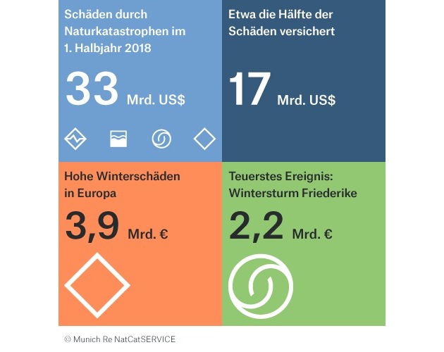 Naturkatastrophen haben im 1. Halbjahr 2018 weltweit deutlich weniger Schäden verursacht als üblich. Die Gesamtschäden betrugen nach vorläufigen Zahlen rund 33 Mrd. US$, der niedrigste Stand seit 2005 (inflationsbereinigt 29 Mrd. US$).