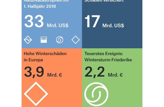 Naturkatastrophen haben im 1. Halbjahr 2018 weltweit deutlich weniger Schäden verursacht als üblich. Die Gesamtschäden betrugen nach vorläufigen Zahlen rund 33 Mrd. US$, der niedrigste Stand seit 2005 (inflationsbereinigt 29 Mrd. US$).