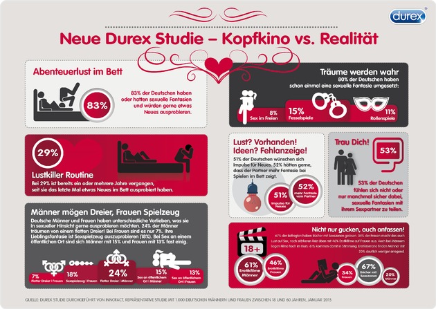 Durch die Etablierung erotischer Romane im Mainstream und dem offenen Umgang mit Sexualität in Film und Fernsehen wirkt es, als wäre Deutschland ein Land voll sexueller Abenteurer. Jedoch belassen es viele Menschen bei der bloßen Fantasie und übertragen ihre Träume nicht in ihre Partnerschaft. Es scheint so, als fehle häufig die Inspiration, neue Dinge auszuprobieren und der Mut, sich dem Partner zu öffnen. 53% der Studienteilnehmer fühlen sich nicht oder nur manchmal sicher dabei, sexuelle Fantasien mit ihrem Sexpartner zu teilen.