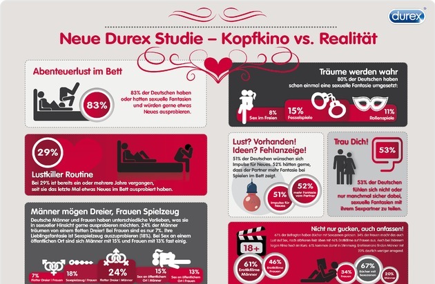 Durch die Etablierung erotischer Romane im Mainstream und dem offenen Umgang mit Sexualität in Film und Fernsehen wirkt es, als wäre Deutschland ein Land voll sexueller Abenteurer. Jedoch belassen es viele Menschen bei der bloßen Fantasie und übertragen ihre Träume nicht in ihre Partnerschaft. Es scheint so, als fehle häufig die Inspiration, neue Dinge auszuprobieren und der Mut, sich dem Partner zu öffnen. 53% der Studienteilnehmer fühlen sich nicht oder nur manchmal sicher dabei, sexuelle Fantasien mit ihrem Sexpartner zu teilen.