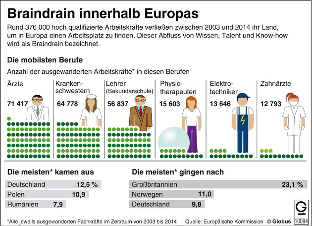 Grafiken liefern die wichtigsten Informationen und Hintergründe auf einen Blick. Seit mehr als 60 Jahren versorgt dpa-infografik, ein Tochterunternehmen der Nachrichtenagentur dpa, Medien, Unternehmen, Regierungen, Verbände und Bildungseinrichtungen mit spannenden Schaubildern zu den großen Themen aus Politik, Wirtschaft, Gesellschaft und Kultur. Monatlich veröffentlichen wir ein Highlight aus dem umfangreichen Angebot der dpa-infografik im Presseportal als "Grafik des Monats". Diesen Monat geht es um ein Wirtschaftsthema: "Braindrain innerhalb Europas - Die mobilsten Berufe".