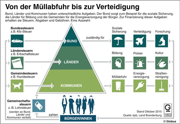 Grafiken liefern die wichtigsten Informationen und Hintergründe auf einen Blick. Seit mehr als 60 Jahren versorgt dpa-infografik, ein Tochterunternehmen der Nachrichtenagentur dpa, Medien, Unternehmen, Regierungen, Verbände und Bildungseinrichtungen mit spannenden Schaubildern zu den großen Themen aus Politik, Wirtschaft, Gesellschaft und Kultur. Monatlich veröffentlichen wir ein Highlight aus dem umfangreichen Angebot der dpa-infografik im Presseportal als "Grafik des Monats". Diesen Monat geht es um die Pflichten, die sich der Bund, die Länder und die Gemeinden in Deutschland teilen.