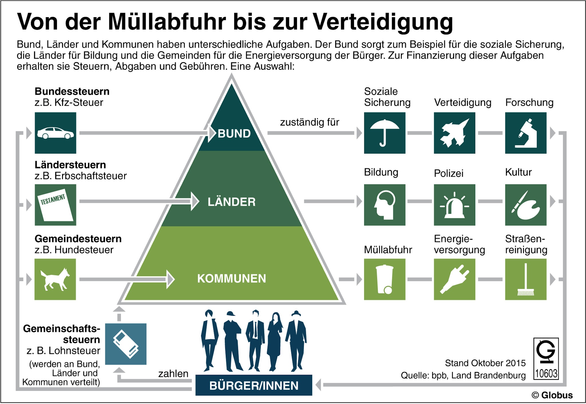 Grafiken liefern die wichtigsten Informationen und Hintergründe auf einen Blick. Seit mehr als 60 Jahren versorgt dpa-infografik, ein Tochterunternehmen der Nachrichtenagentur dpa, Medien, Unternehmen, Regierungen, Verbände und Bildungseinrichtungen mit spannenden Schaubildern zu den großen Themen aus Politik, Wirtschaft, Gesellschaft und Kultur. Monatlich veröffentlichen wir ein Highlight aus dem umfangreichen Angebot der dpa-infografik im Presseportal als "Grafik des Monats". Diesen Monat geht es um die Pflichten, die sich der Bund, die Länder und die Gemeinden in Deutschland teilen.