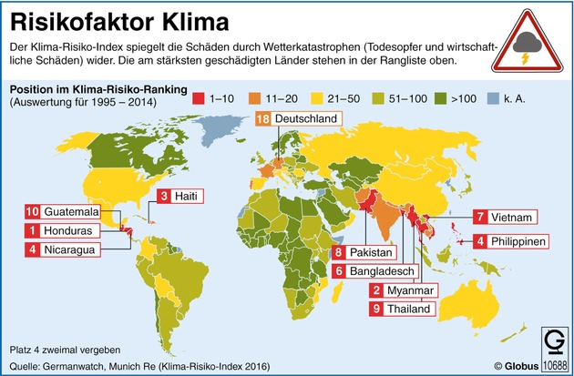 Grafiken liefern die wichtigsten Informationen und Hintergründe auf einen Blick. Seit mehr als 60 Jahren versorgt dpa-infografik, ein Tochterunternehmen der Nachrichtenagentur dpa, Medien, Unternehmen, Regierungen, Verbände und Bildungseinrichtungen mit spannenden Schaubildern zu den großen Themen aus Politik, Wirtschaft, Gesellschaft und Kultur. Monatlich veröffentlichen wir ein Highlight aus dem umfangreichen Angebot der dpa-infografik im Presseportal als "Grafik des Monats". Unser aktuelles Thema: Der globale Klima-Risiko-Index - ein Ranking, das zeigt, wie stark Länder von extremen Wetterereignissen betroffen sind.