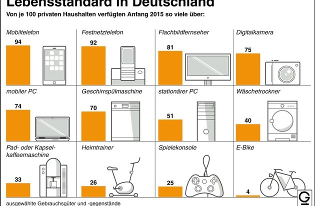 Grafiken liefern die wichtigsten Informationen und Hintergründe auf einen Blick. Seit mehr als 60 Jahren versorgt dpa-infografik, ein Tochterunternehmen der Nachrichtenagentur dpa, Medien, Unternehmen, Regierungen, Verbände und Bildungseinrichtungen mit spannenden Schaubildern zu den großen Themen aus Politik, Wirtschaft, Gesellschaft und Kultur. Monatlich veröffentlichen wir ein Highlight aus dem umfangreichen Angebot der dpa-infografik im Presseportal als "Grafik des Monats". Diesen Monat geht es um die Ausstattung deutscher Haushalte mit Gebrauchsgütern wie Mobiltelefonen, Geschirrspülern oder Heimtrainern.