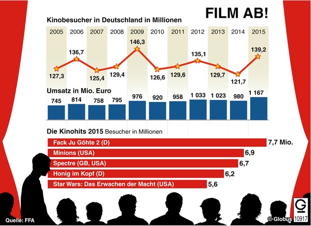 Grafiken liefern die wichtigsten Informationen und Hintergründe auf einen Blick. Seit 70 Jahren versorgt dpa-infografik, ein Tochterunternehmen der Nachrichtenagentur dpa, Medien, Unternehmen, Regierungen, Verbände und Bildungseinrichtungen mit spannenden Schaubildern zu den großen Themen aus Politik, Wirtschaft, Gesellschaft und Kultur. Monatlich veröffentlichen wir ein Highlight aus dem umfangreichen Angebot der dpa-infografik im Presseportal als "Grafik des Monats". Diesen Monat geht es um ein Medien-Thema: Kinobesucher und Kinohits 2015 in Deutschland.