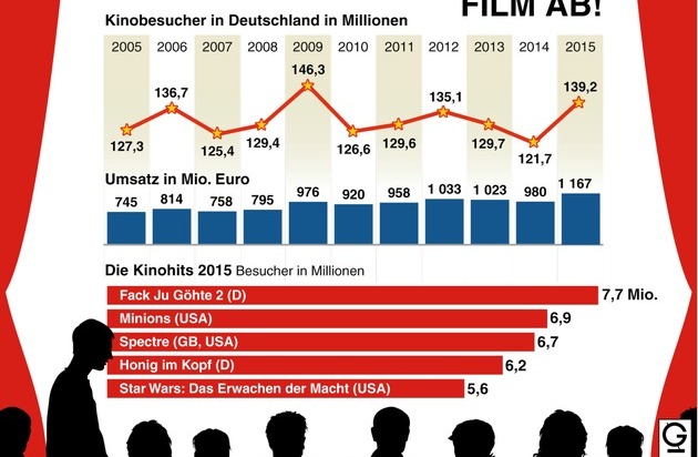 Grafiken liefern die wichtigsten Informationen und Hintergründe auf einen Blick. Seit 70 Jahren versorgt dpa-infografik, ein Tochterunternehmen der Nachrichtenagentur dpa, Medien, Unternehmen, Regierungen, Verbände und Bildungseinrichtungen mit spannenden Schaubildern zu den großen Themen aus Politik, Wirtschaft, Gesellschaft und Kultur. Monatlich veröffentlichen wir ein Highlight aus dem umfangreichen Angebot der dpa-infografik im Presseportal als "Grafik des Monats". Diesen Monat geht es um ein Medien-Thema: Kinobesucher und Kinohits 2015 in Deutschland.