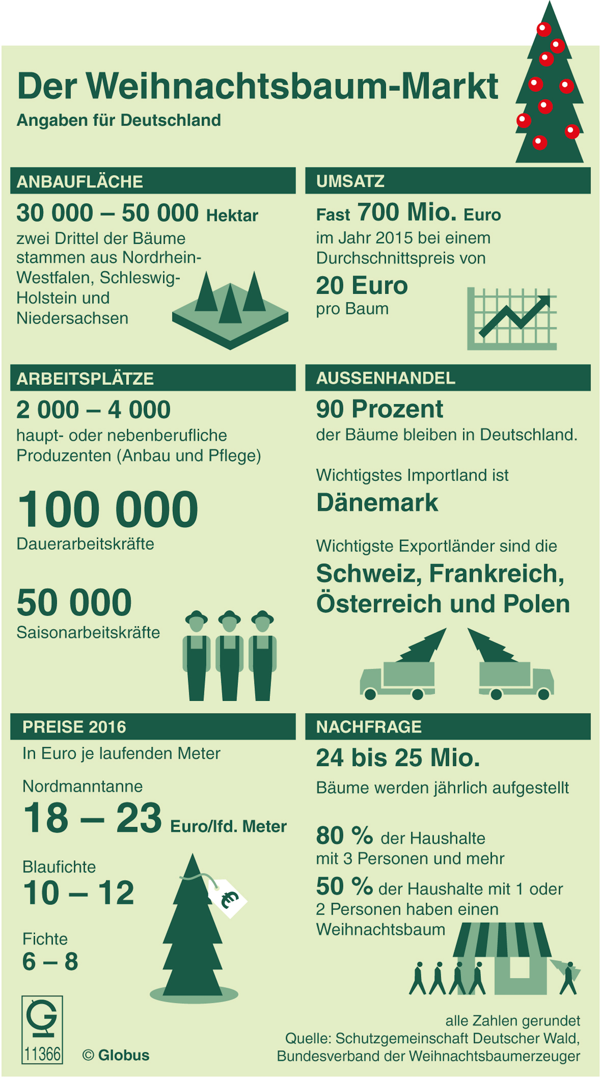 Jedes Jahr zur Weihnachtszeit stehen 24 bis 25 Millionen Weihnachtsbäume in den Wohnungen in Deutschland. 90 Prozent von ihnen stammen aus heimischem Anbau. Nach Angaben der Schutzgemeinschaft Deutscher Wald kommen die meisten Weihnachtsbäume aus Nordrhein-Westfalen und hier vor allem aus dem Sauerland. Auf einer Fläche von 12 500 Hektar werden dort Weihnachtsbäume angebaut. Bundesweit beträgt die Größe der Anbaufläche zwischen 30 000 und 50 000 Hektar. Beliebtester Weihnachtsbaum bei den Verbrauchern ist die Nordmanntanne. Den Angaben des Bundesverbandes der Weihnachtsbaumerzeuger zufolge geht der Trend zum kleineren Baum mit einer Höhe von 1,50 bis 1,75 Meter. Auch die Nachfrage nach "Rundumsorglos-Paketen" nimmt zu, bei denen der Weihnachtsbaum schon auf einem Ständer, möglichst bereits geschmückt, per Post geliefert und nach den Weihnachtsfeiertagen wieder abgeholt wird.