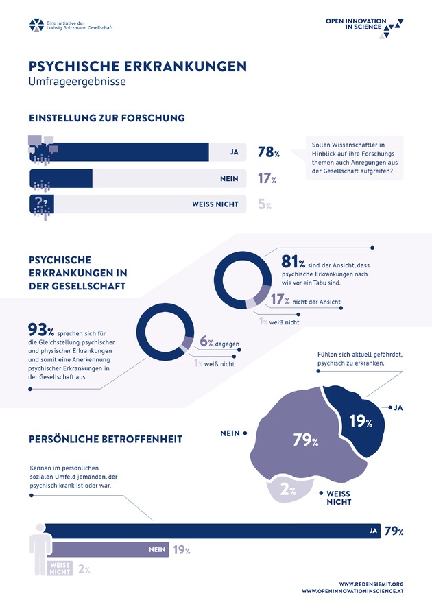 Erkrankungen mitentscheidenDie Ergebnisse einer repräsentativen Studie des österreichischen Gallup-Instituts bestätigen - psychische Erkrankungen sind zwar noch immer ein Tabuthema aber auch ein allgegenwärtiges Phänomen: 80 Prozent der Befragten gaben an, im persönlichen Umfeld von psychischen Erkrankungen betroffen zu sein. Das belegen die Ergebnisse einer repräsentativen Studie des österreichischen Gallup-Instituts, das im Auftrag der Initiative "Open Innovation in Science" der Ludwig Boltzmann Gesellschaft 1.000 Personen befragt hat. Unter dem Motto "Reden Sie mit!" können sich Betroffene, Spezialisten und Interessierte ab dem 16. April unter www.redensiemit.org aktiv an der Entwicklung von wissenschaftlichen Forschungsfragen zum Thema psychische Erkrankungen beteiligen.