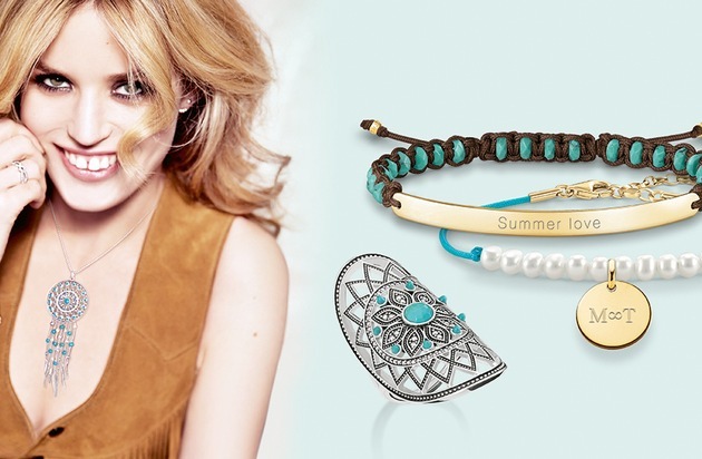 Besonders stilvoll sind die kunstvoll gearbeiteten vielfältigen Dreamcatcher-Schmuckstücke: Jede Kette, jedes Armband und jeder Ring der Serie wird geziert von filigranen Federn, feinen Ornamenten sowie imitierten Türkis-Steinen im Ethno-Style - immer in der ikonischen THOMAS SABO Designsprache. Boho at its best: Die fantasievollen Traumfänger-Eyecatcher sind die perfekten Begleiter für die kommenden Musik-Festivals! Passend zu diesem trendigen Sommer-Outfit zeigen sich auch die neuen "Festival" sowie "Boho" Love Bridge Armbänder, die im Nu ein Gefühl von Leichtigkeit, sommerlicher Farbenfreude und Lässigkeit vermitteln: Handgeknüpft in einer hochwertigen Makramee-Technik zeigt das farbenfrohe Armband mit personalisierbaren Festival-Mottos an den Enden jeweils niedliche Motive wie Seesterne, Herzen, Muscheln oder Schmetterlinge. Gute Laune ans Handgelenk bringen auch die individuell gravierbaren Armbänder mit wirkungsvollen Edelsteinen.