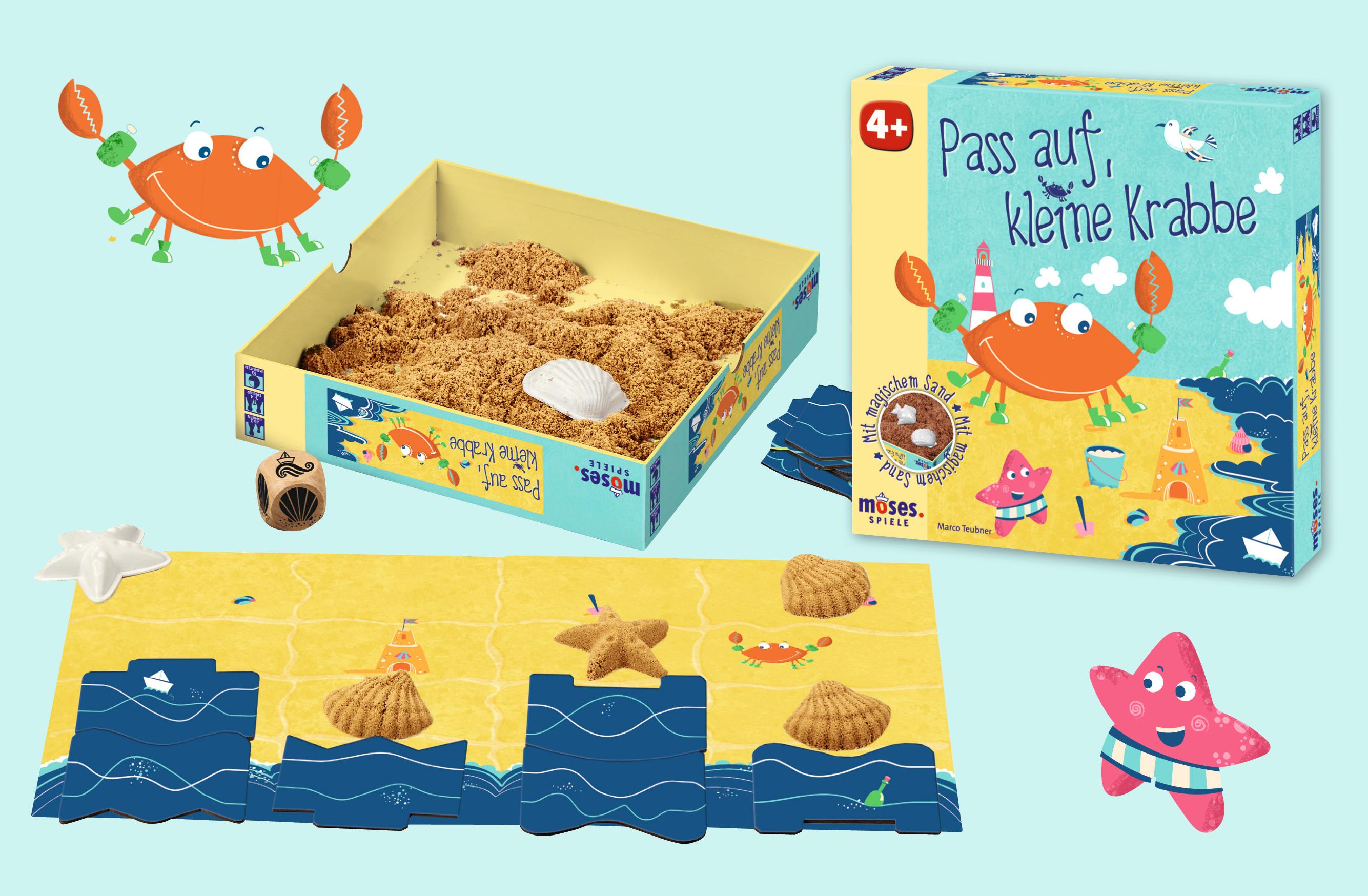 Nun gibt es ein Brettspiel, das genau dieses Spielprinzip aufgreift. "Pass auf, kleine Krabbe". Einen Strand braucht man dafür nicht: Unser neues Spiele-Highlight enthält nämlich den sogenannten kinetischen Sand, auch "Zaubersand" genannt - der absolute Trend in den Kindergärten und auch schon in vielen Kinderzimmern. Dieser ist speziell für Drinnen gedacht, hat immer die richtige Konsistenz für die Sandkuchen und bleibt immer genau da, wo er sein soll!