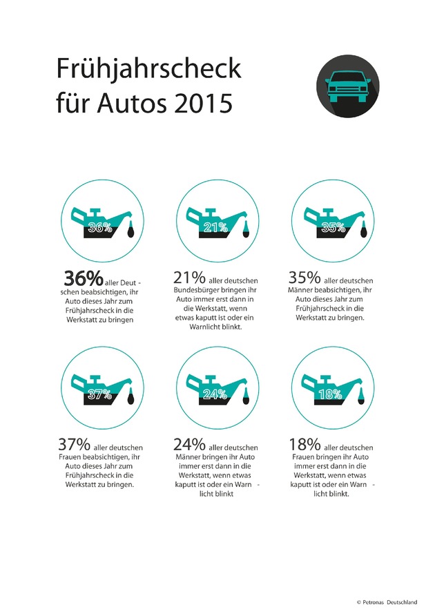 36 Prozent aller Deutschen werden ihr Auto dieses Jahr zum Frühjahrscheck bringen. Das ergab eine repräsentative Umfrage* im Auftrag von PETRONAS Deutschland. Der führende Hersteller von Premium-Motorenölen wollte wissen, wie wichtig den Bundesbürgern die regelmäßige Kontrolle ihres Kraftfahrzeugs durch einen KFZ-Fachbetrieb ist. Dabei ist die Zahl derer, die den Check auf die leichte Schulter nehmen zwar geringer, aber nicht zu vernachlässigen: 21 Prozent aller Bundesbürger bringen ihr Auto immer erst dann in die Werkstatt, wenn etwas kaputt ist oder ein Warnlicht blinkt.