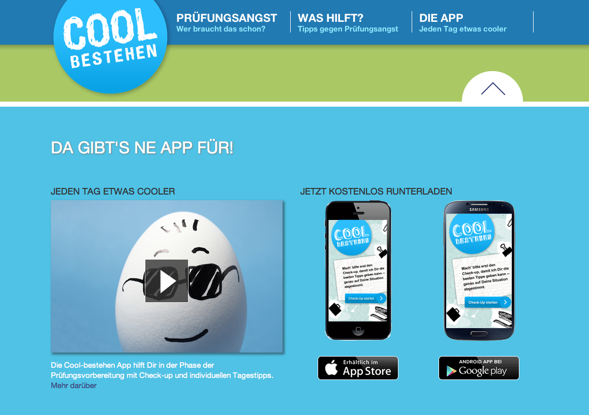 Die mobile Internetnutzung per Smartphone ermöglicht jederzeit den schnellen und bequemen Zugriff auf Informationen oder Unterhaltung. Damit lässt sich auch Prüfungsgestressten helfen, ihren emotionalen Ausnahmezustand besser zu bewältigen. Das hilfreiche Programm ermittelt zunächst Eckdaten zu Prüfungstermin und -art, Vorbereitungsstatus und dem individuellen Angst-Level. Auf Basis dieser Auswertung bietet "CoolBestehen" regelmäßiges Coaching - auf Wunsch täglich zur gleichen Zeit. Eine Funktion erinnert an die noch verbleibende Zeit bis zum Prüfungstermin, für den täglich überprüften Nervositätspegel wird mit passenden Entspannungstipps gegengesteuert. Außerdem erklärt die App, wie Prüfungsangst überhaupt entsteht und mit welchen Methoden sie sich wirkungsvoll bekämpfen lässt. Die App ist nicht nur gut bedienbar und leicht zu installieren - der Umgang mit ihren Inhalten und Funktionen macht darüber hinaus auch Spaß.