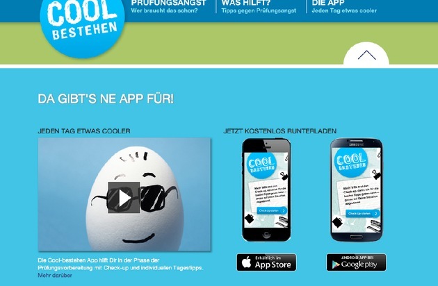 Eine neue App soll aufgeregte Schüler und Studenten bei ihren Prüfungsvorbereitungen unterstützen und ihnen helfen, ihre Angst in den Griff zu bekommen. Entwickelt wurde die "CoolBestehen" App von PASCOE Naturmedizin. Sie ist ab sofort im App Store (http://ots.de/ix9Tl) und bei Google Play (http://ots.de/hlEYS) verfügbar.